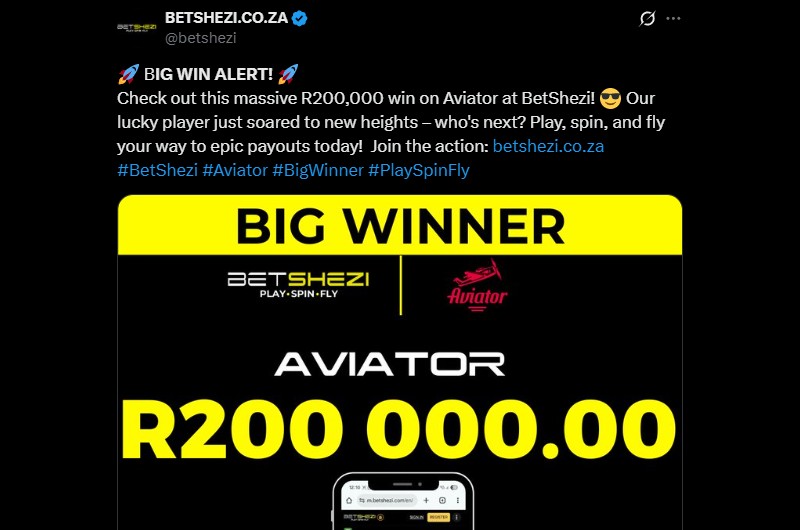 BetShezi has announced that one of its members has managed to win as much as R200,000 while playing Spribe’s ever-popular ‘Aviator’ crash game.