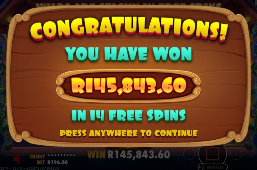 By the end of the bonus round, the total win had climbed to R145,843.60, an incredible 744.1 times the original bet amount.