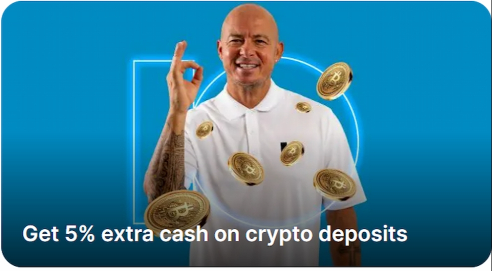 - 5% extra cash added automatically to qualifying cryptocurrency deposits