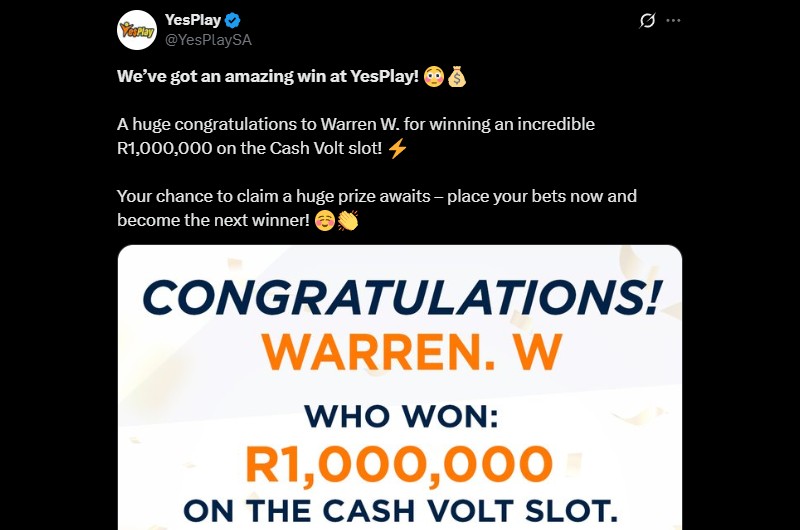 YesPlay slot player strikes it rich with R1,000,000 win on Cash Volt by Red Tiger.
